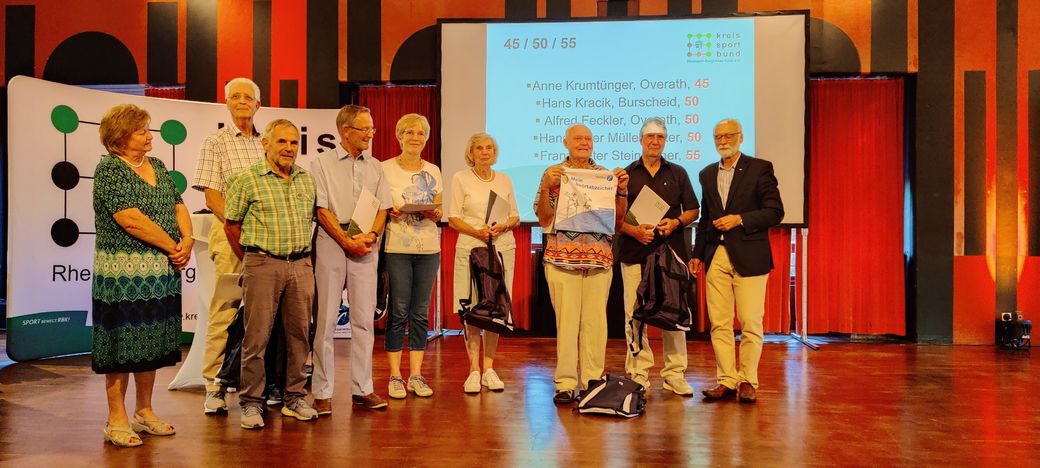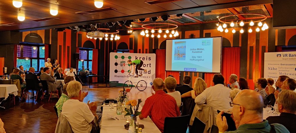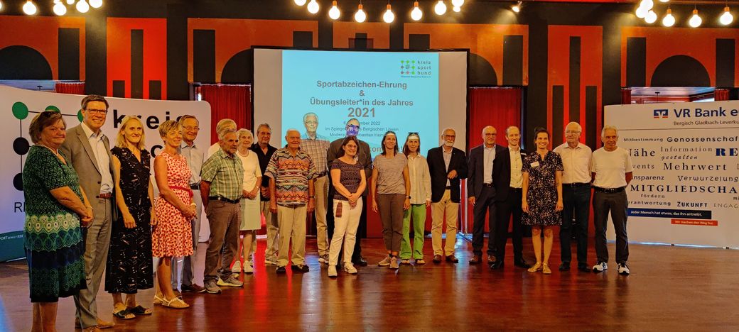 Der Kreissportbund Rheinisch-Bergischer Kreis e.V. (KSB) und die VR Bank eG Bergisch Gladbach-Leverkusen haben auch in diesem Jahr wieder Mehrfachableger*innen des Deutschen Sportabzeichens und verdiente Übungsleiter*innen geehrt. Insgesamt 17 Sportler*innen aus dem Rheinisch-Bergischen Kreis wurden für besondere sportliche Leistungen und herausragendes Engagement im Ehrenamt ausgezeichnet. Das sportliche Rahmenprogramm der feierlichen Veranstaltung im Bergischen Löwen in Bergisch Gladbach bestritt die Kunstradfahrerin Julica Müller vom Radsport-Verein "Blitz" 1901 Hoffnungsthal e.V. sowie die Cheerleader des TV Refrath.