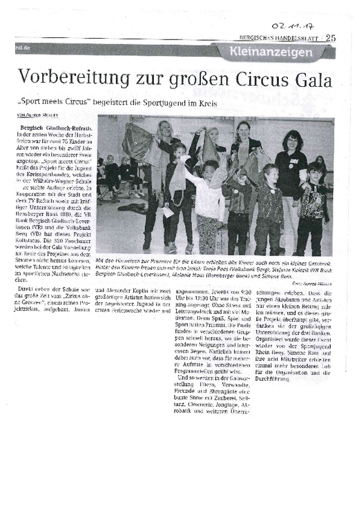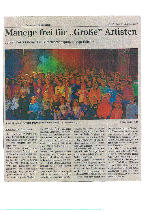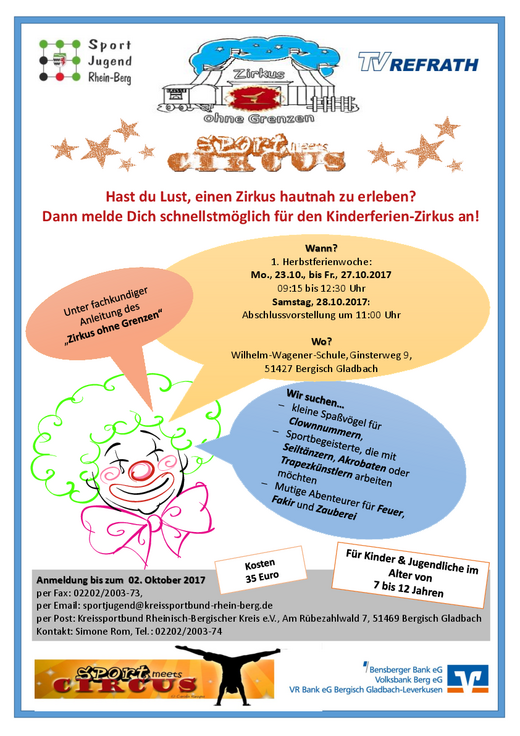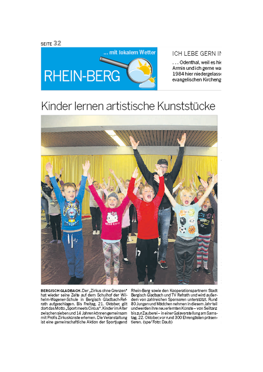 Am vergangenen Samstag öffnete das Zirkuszelt zur Abschlussvorstellung des Zirkusprojekts „Sport meets Circus 2017!“ auf dem Gelände der Wilhelm-Wagener-Schule in Refrath, das die Sportjugend Rhein-Berg in Kooperation mit dem TV Refrath e.V. anbot. Zusammen mit Janina und Alexander Koplin vom „Zirkus ohne Grenzen“ und den vielen Helferinnen und Helfern übten 70 Kinder im Alter von sieben bis zwölf Jahren eine Woche lang vormittags Kunststücke aus verschiedenen Bereichen der Zirkuswelt ein.
