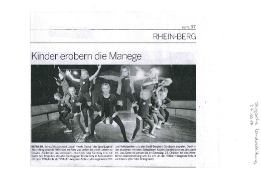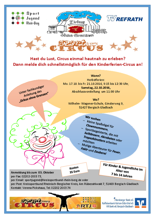 Die Sportjugend Rhein-Berg veranstaltet dieses Projekt in Kooperation mit dem TV Refrath e.V.. Unter der professionellen Anleitung Janina und Alexander Koplin vom „Zirkus ohne Grenzen“ bereiteten sich die Kinder eine Woche lang vormittags, in der Zeit von 9:15 – 12:30 Uhr, auf ihren großen Auftritt vor. Dabei wurden sie von 9 Helferinnen und Helfern im Alter von 13 bis 18 Jahren und zwei Projektleitern tatkräftig unterstützt.